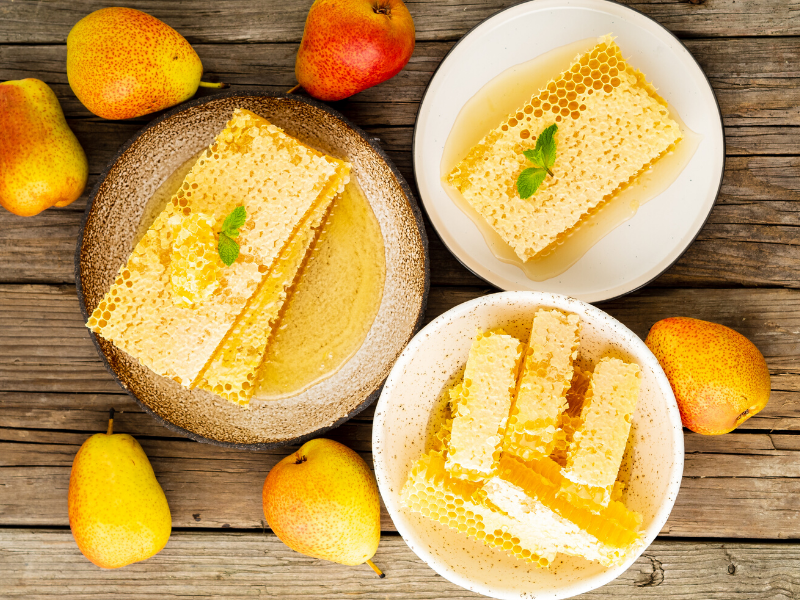 La miel en panal, además de la calidad de la miel cuenta con los componentes extra del propóleo, el polen y la cera, por lo que se suman vitaminas minerales y aminoácidos.